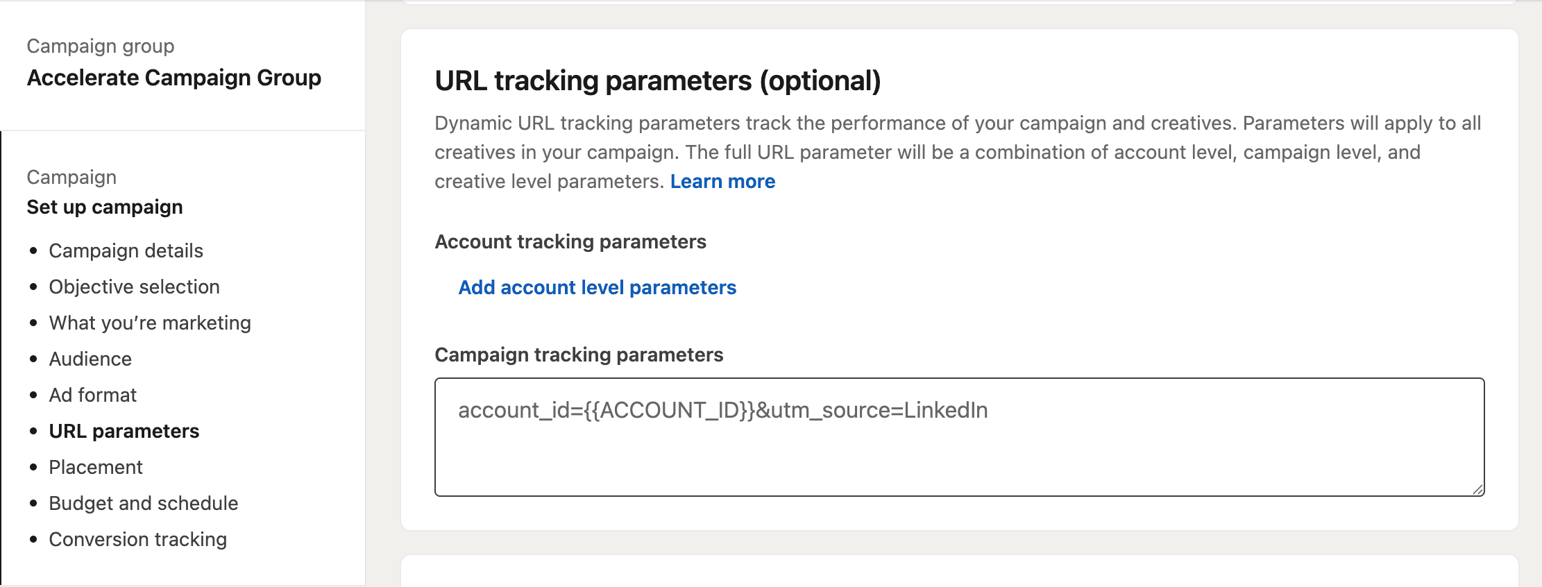 LinkedIn displays a preview of your final URL with parameters attached. Verify it looks correct before saving.